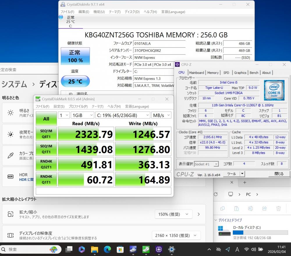 | CPU: 超高速 Intel 卓越性能 第11世代Core i5-1130G7 1.8Ghz、 4コア8スレッド (ターボ・ブースト利用時の最大周波数 4.0GHz) |