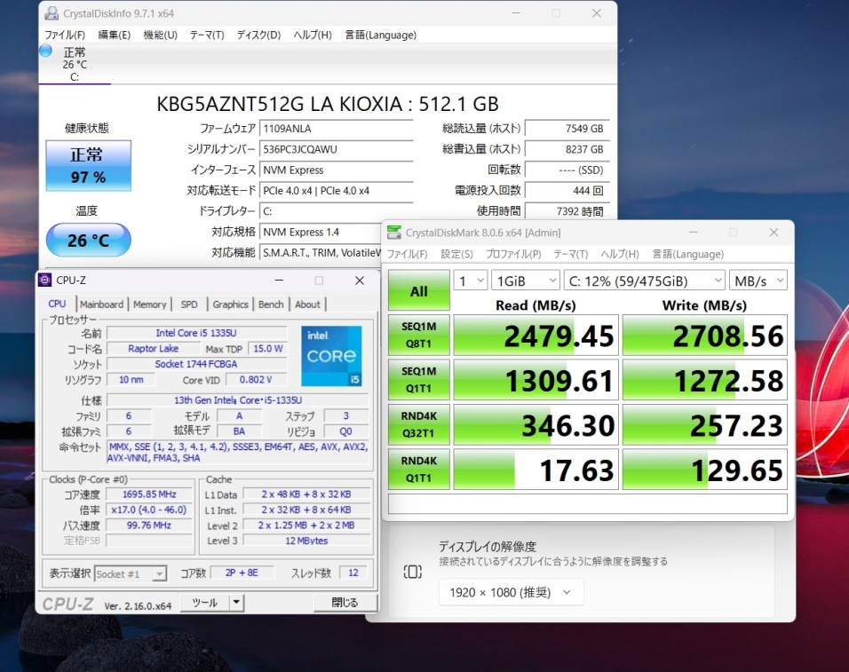 | CPU: 超高速 Intel 10コア 卓越性能 第13世代Core i5-1335U 1.3Ghz、 10コア12スレッド (ターボ・ブースト利用時の最大周波数 4.6GHz) |