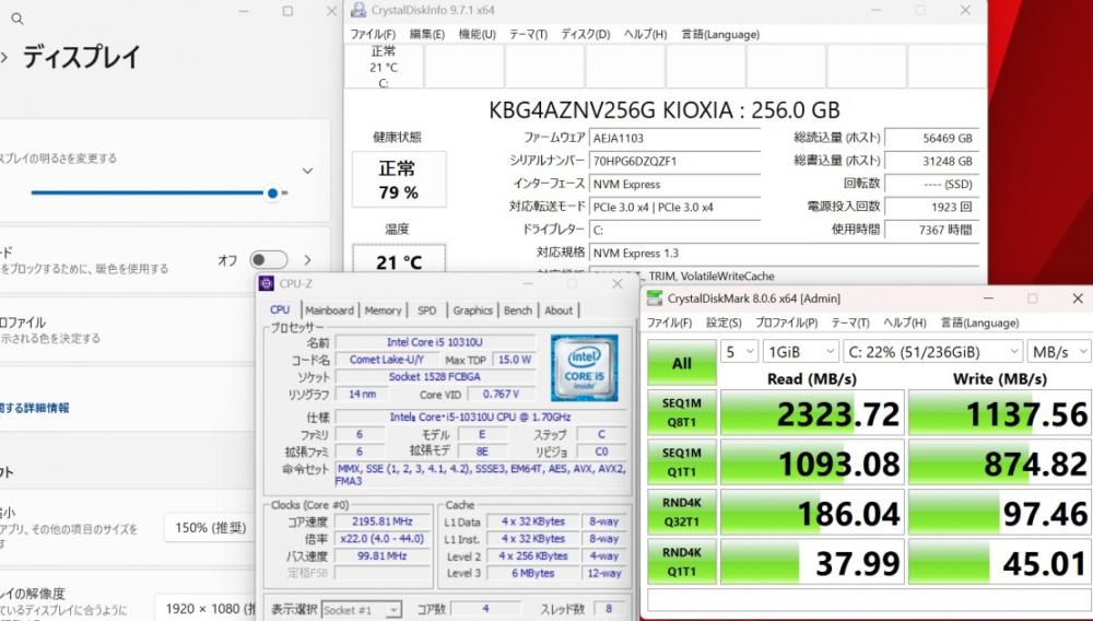 | CPU: 超高速 Intel 超高性能 第10世代Core i5-10310u 1.7Ghz、 4コア8スレッド (ターボ・ブースト利用時の最大周波数 4.4GHz) |