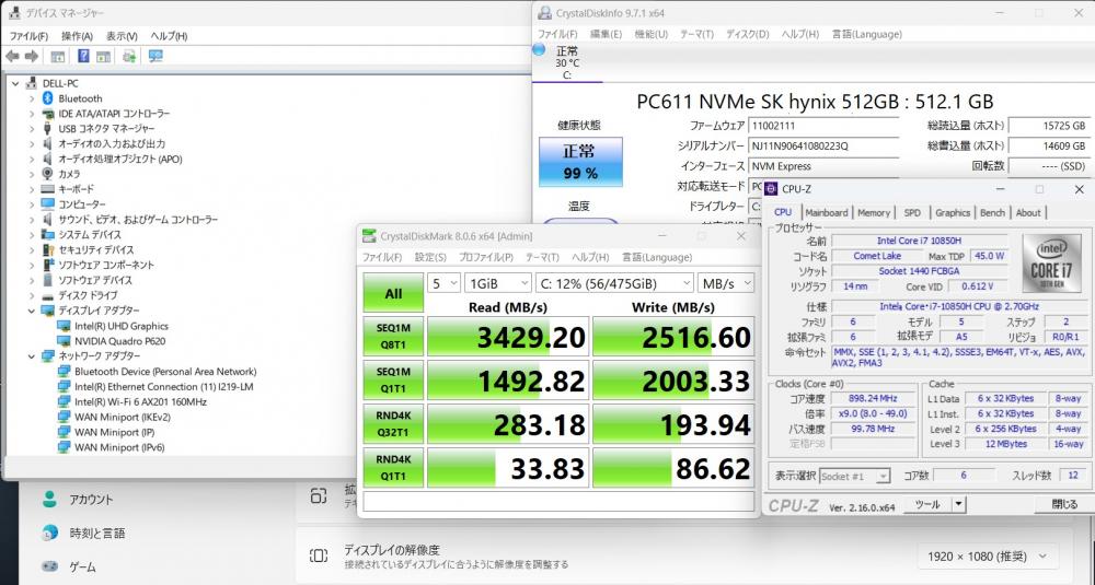 | CPU: 超高速 Intel 超高性能 第10世代Core i7-10850H 2.7Ghz、 6コア12スレッド (ターボ・ブースト利用時の最大周波数 5.1GHz) |