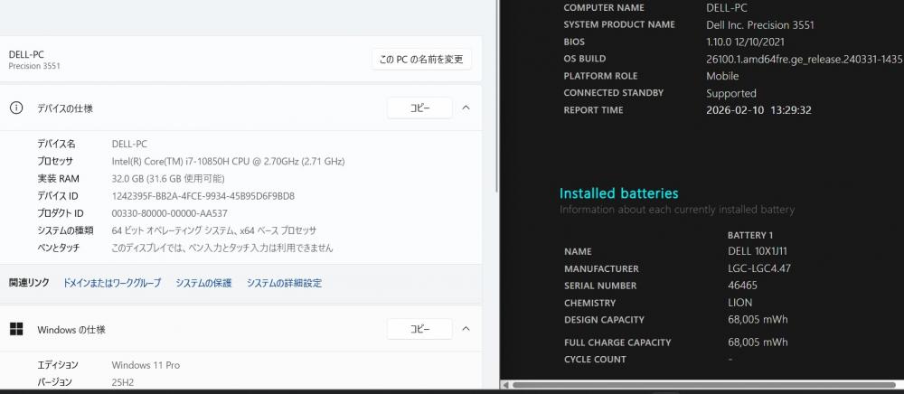 CPU:    超高速 Intel 超高性能 第10世代Core i7-10850H 2.7Ghz、 6コア12スレッド (ターボ・ブースト利用時の最大周波数 5.1GHz)