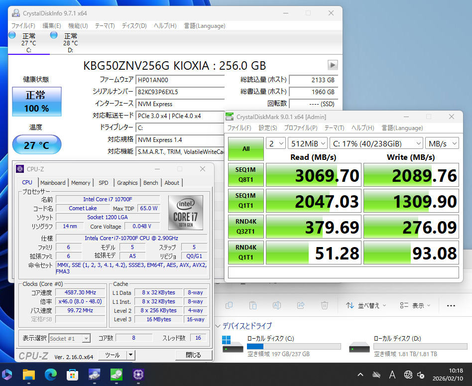 | CPU: 超高速 Intel 8コア 超高性能 第10世代Core i7-10700F 2.9Ghz、 8コア16スレッド (ターボ・ブースト利用時の最大周波数 4.8GHz) |