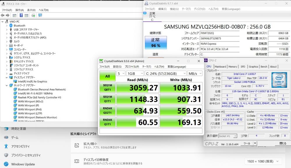| CPU: 超高速 Intel 卓越性能 第11世代Core i7-1165G7 2.8Ghz、 4コア8スレッド (ターボ・ブースト利用時の最大周波数 4.7GHz) |