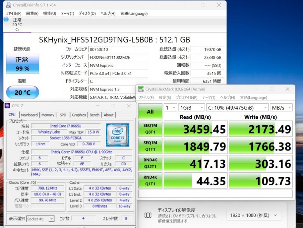 CPU:    超高速 Intel 高性能 第8世代Core i7-8665U 1.9Ghz、 4コア8スレッド (ターボ・ブースト利用時の最大周波数 4.8GHz)