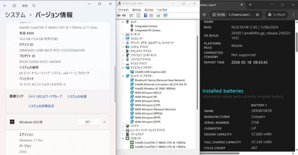 バッテリー電池の健康度は 83% です。3時間半位も使用可能と表示されている。 バッテリーは消耗品の為、動作補償外となります。
