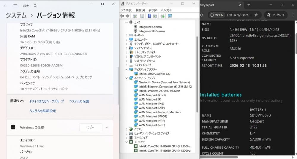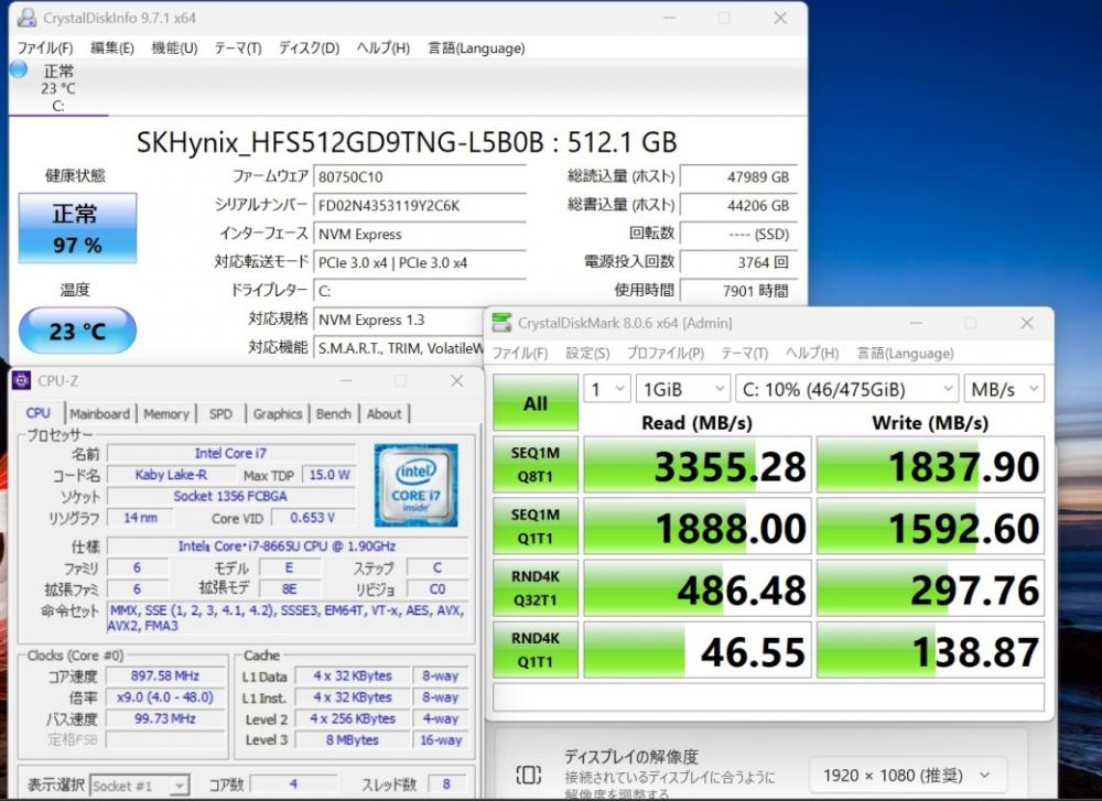CPU:    超高速 Intel 高性能 第8世代Core i7-8665U 1.9Ghz、 4コア8スレッド (ターボ・ブースト利用時の最大周波数 4.8GHz)