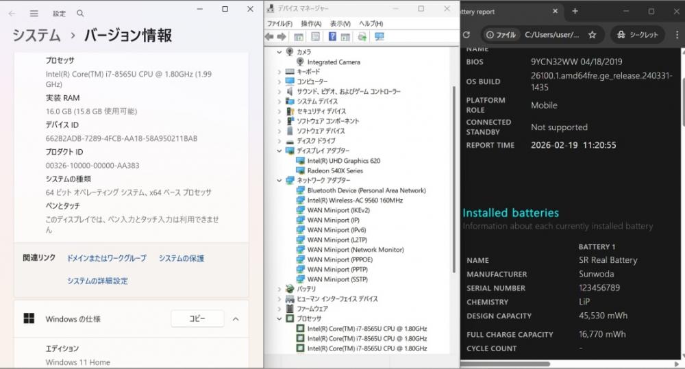| CPU: 超高速 Intel 高性能 第8世代Core i7-8565U 1.8Ghz、 4コア8スレッド (ターボ・ブースト利用時の最大周波数 4.6GHz) |