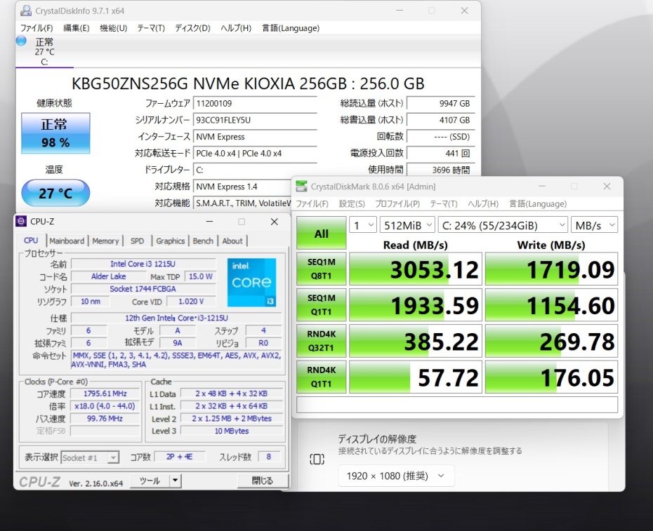 CPU:    超高速 Intel 卓越性能 第12世代Core i3-1215u 1.2Ghz、 6コア8スレッド (ターボ・ブースト利用時の最大周波数 4.4GHz)