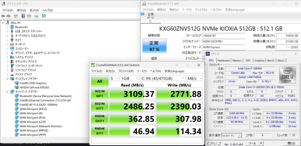 | CPU: 超高速 Intel 超高性能 第10世代Core i7-10850H 2.7Ghz、 6コア12スレッド (ターボ・ブースト利用時の最大周波数 5.1GHz) |