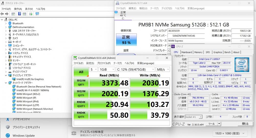 | CPU: 超高速 Intel 卓越性能 第11世代Core i7-1185G7 3.0Ghz、 4コア8スレッド (ターボ・ブースト利用時の最大周波数 4.8GHz) |