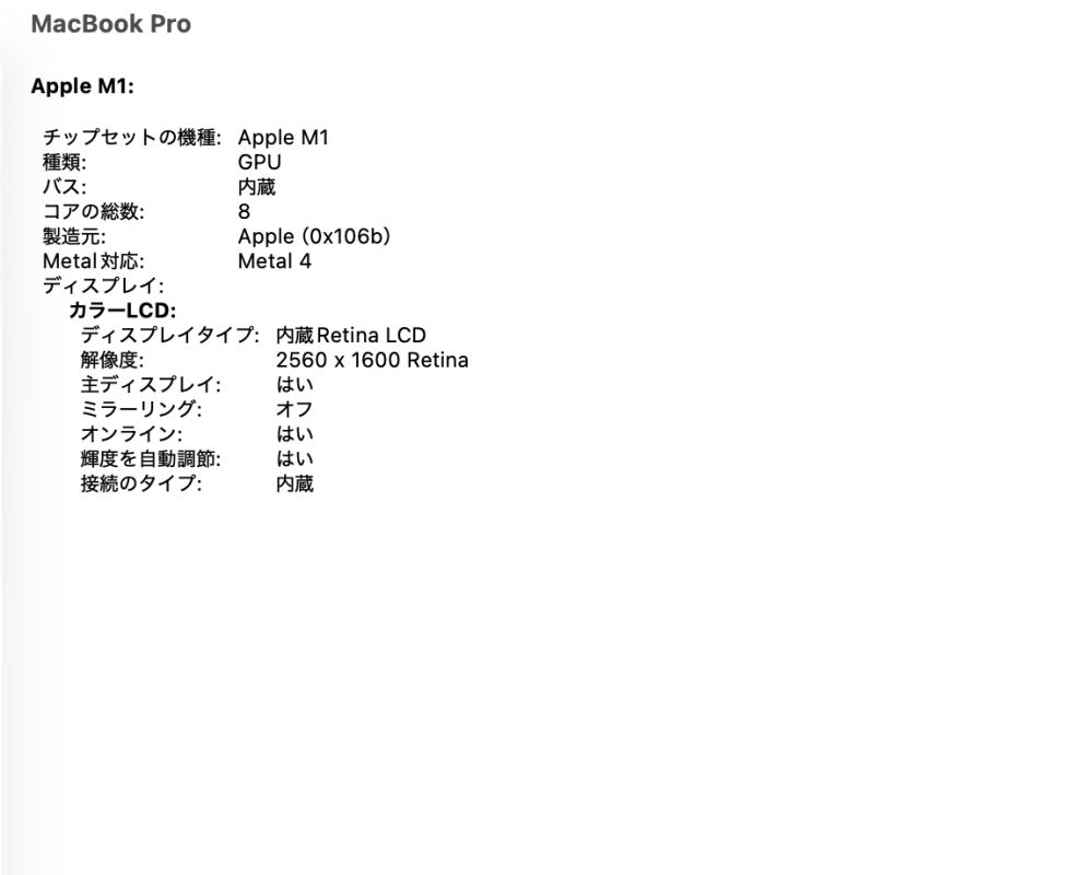 | 型番: Apple MacBook Pro A2338 (2020,M1,8GPU) グレー |