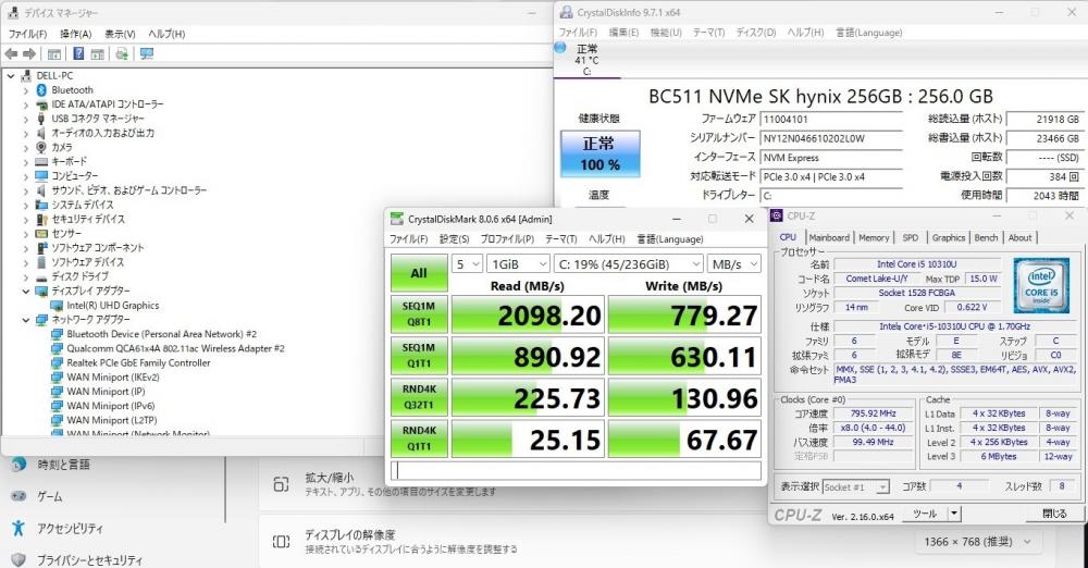 | CPU: 超高速 Intel 超高性能 第10世代Core i5-10310U 1.7Ghz、 4コア8スレッド (ターボ・ブースト利用時の最大周波数 4.4GHz) |