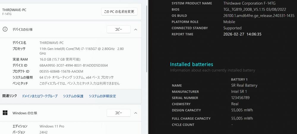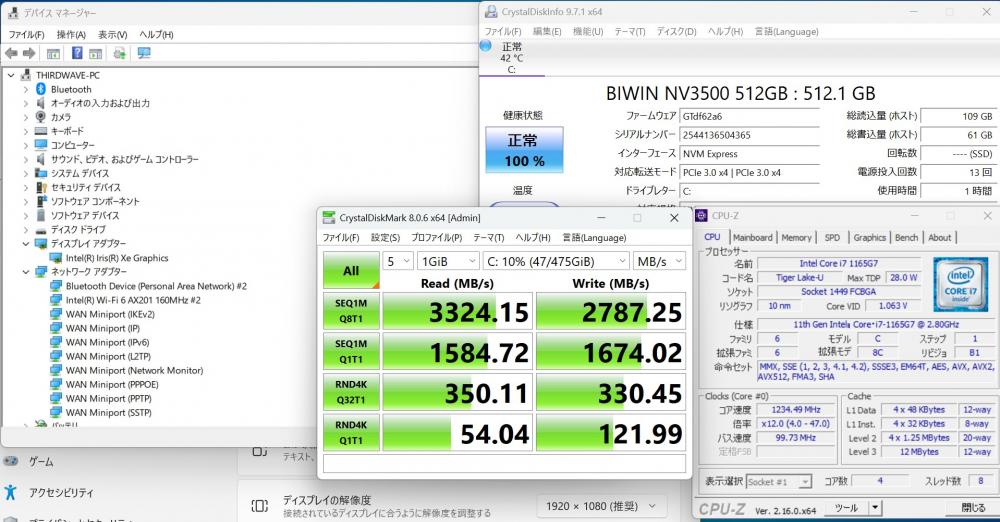 | CPU: 超高速 Intel 卓越性能 第11世代Core i7-1165G7 2.8Ghz、 4コア8スレッド (ターボ・ブースト利用時の最大周波数 4.7GHz) |