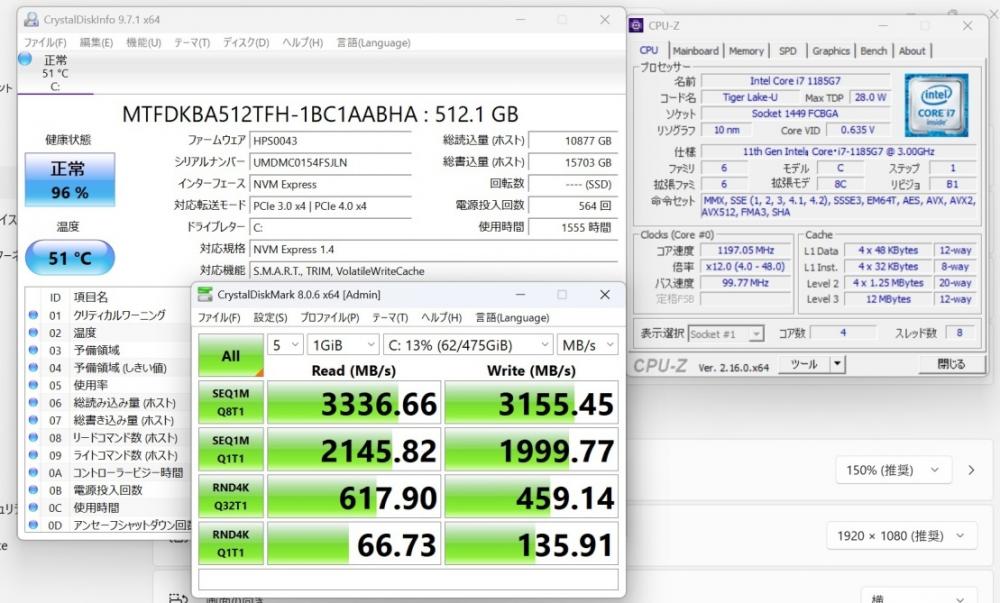 CPU:    超高速 Intel 卓越性能 第11世代Core i7-1185G7 3.0Ghz、 4コア8スレッド (ターボ・ブースト利用時の最大周波数 4.8GHz)