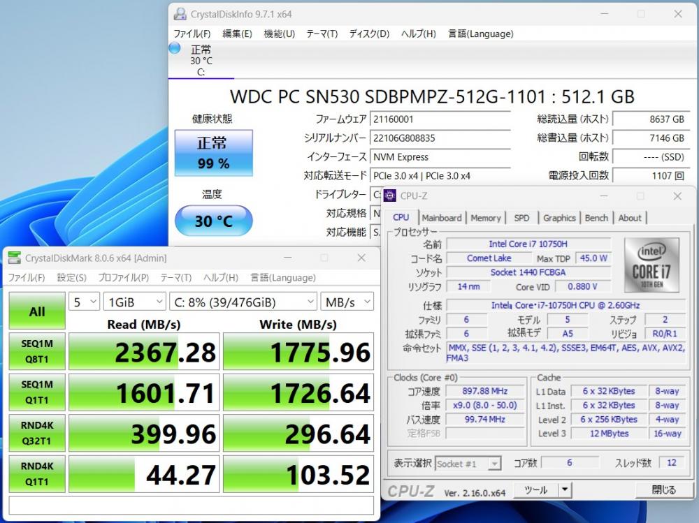 | CPU: 超高速 Intel 超高性能 第10世代Core i7-10750H 2.6Ghz、 6コア12スレッド (ターボ・ブースト利用時の最大周波数 5.0GHz) |