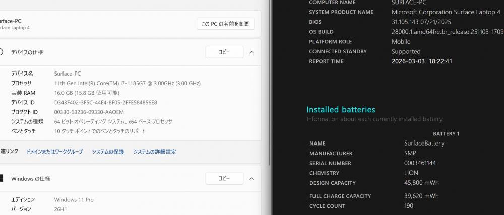 バッテリー電池の健康度は 86% です。4時間位も使用可能と表示されている。 バッテリーは消耗品の為、動作補償外となります。