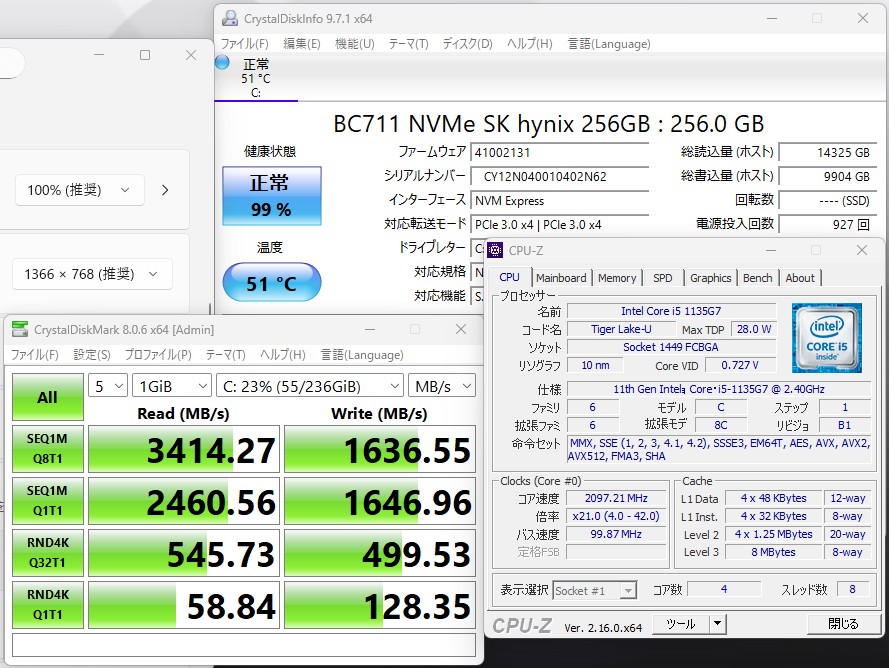 | CPU: 超高速 Intel 卓越性能 第11世代Core i5-1135G7 2.4Ghz、 4コア8スレッド (ターボ・ブースト利用時の最大周波数 4.2GHz) |