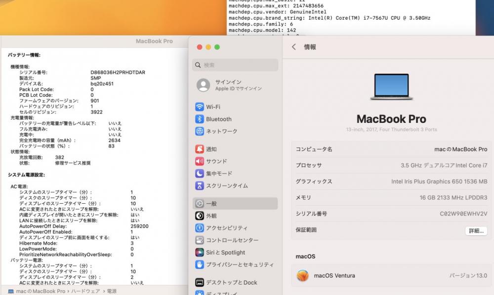 CPU:     七世代Core i7-7567u 3.5Ghz、  (ターボ・ブースト利用時の最大周波数 4.0GHz)