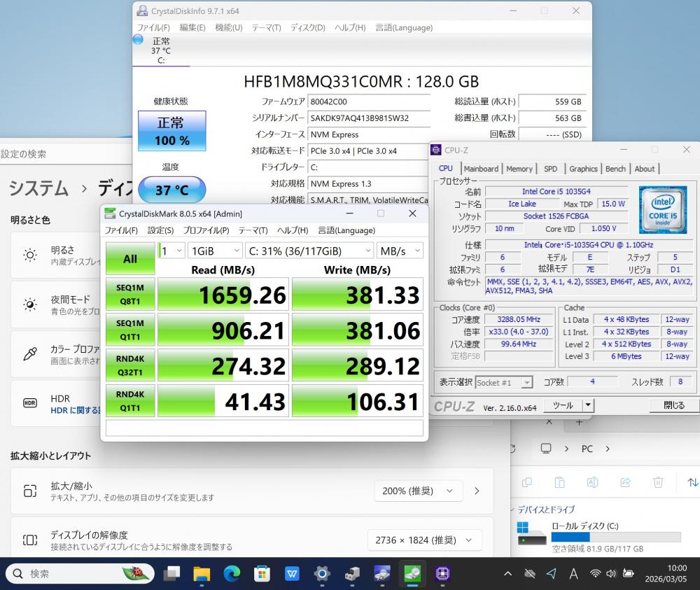 | CPU: 超高速 Intel 超高性能 第10世代Core i5-1035G4 1.1Ghz、 4コア8スレッド (ターボ・ブースト利用時の最大周波数 3.7GHz) |