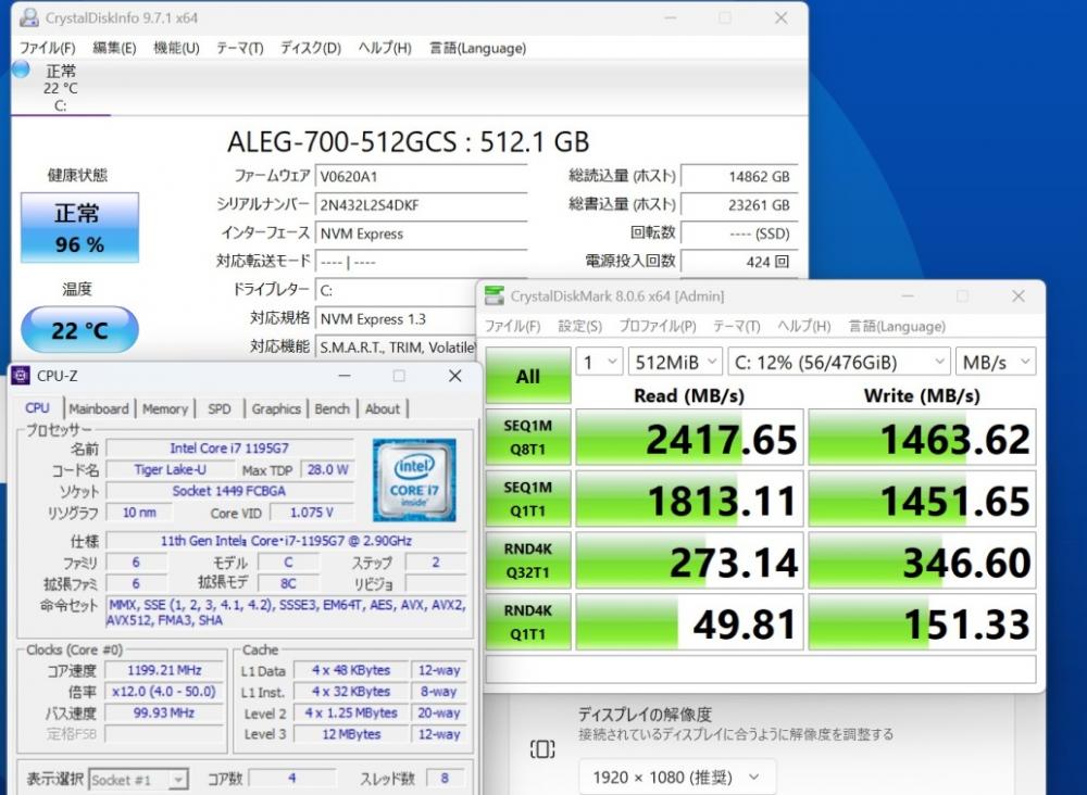 | CPU: 超高速 Intel 卓越性能 第11世代Core i7-1195G7 2.9Ghz、 4コア8スレッド (ターボ・ブースト利用時の最大周波数 5.0GHz) |