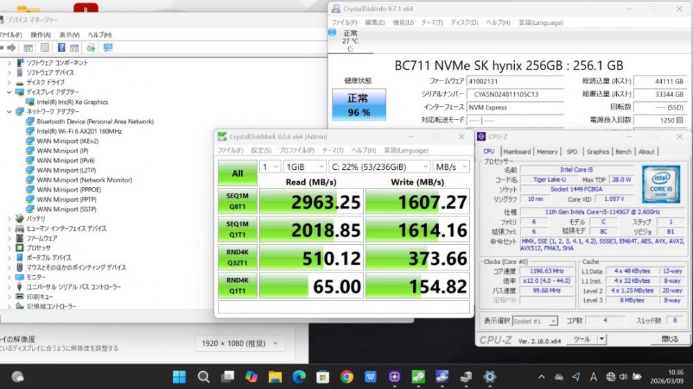 | CPU: 超高速 Intel 卓越性能 第11世代Core i5-1145G7 2.6Ghz、 4コア8スレッド (ターボ・ブースト利用時の最大周波数 4.4GHz) |