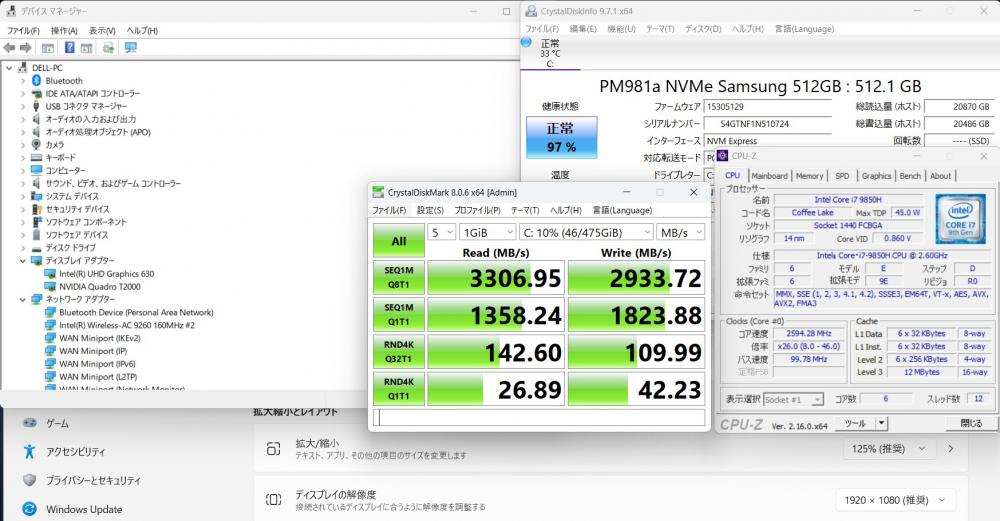 | CPU: 超高速 Intel 超高性能 第9世代Core i7-9850H 2.6Ghz、 6コア12スレッド (ターボ・ブースト利用時の最大周波数 4.6GHz) |