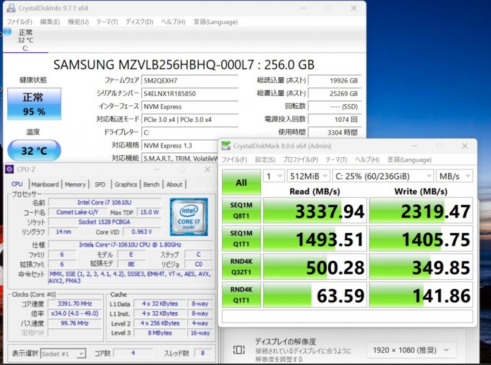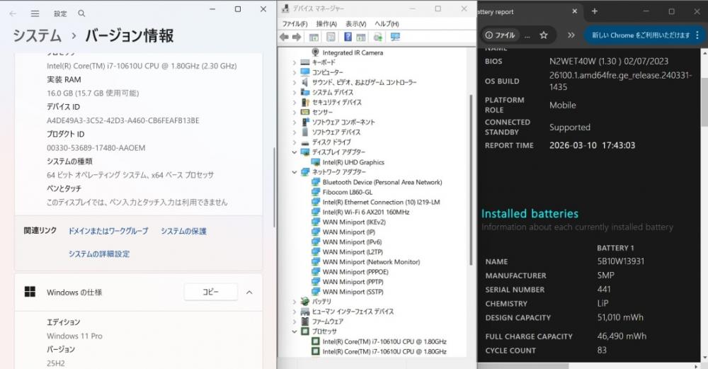 | CPU: 超高速 Intel 超高性能 第10世代Core i7-10610U 1.8Ghz、 4コア8スレッド (ターボ・ブースト利用時の最大周波数 4.9GHz) |