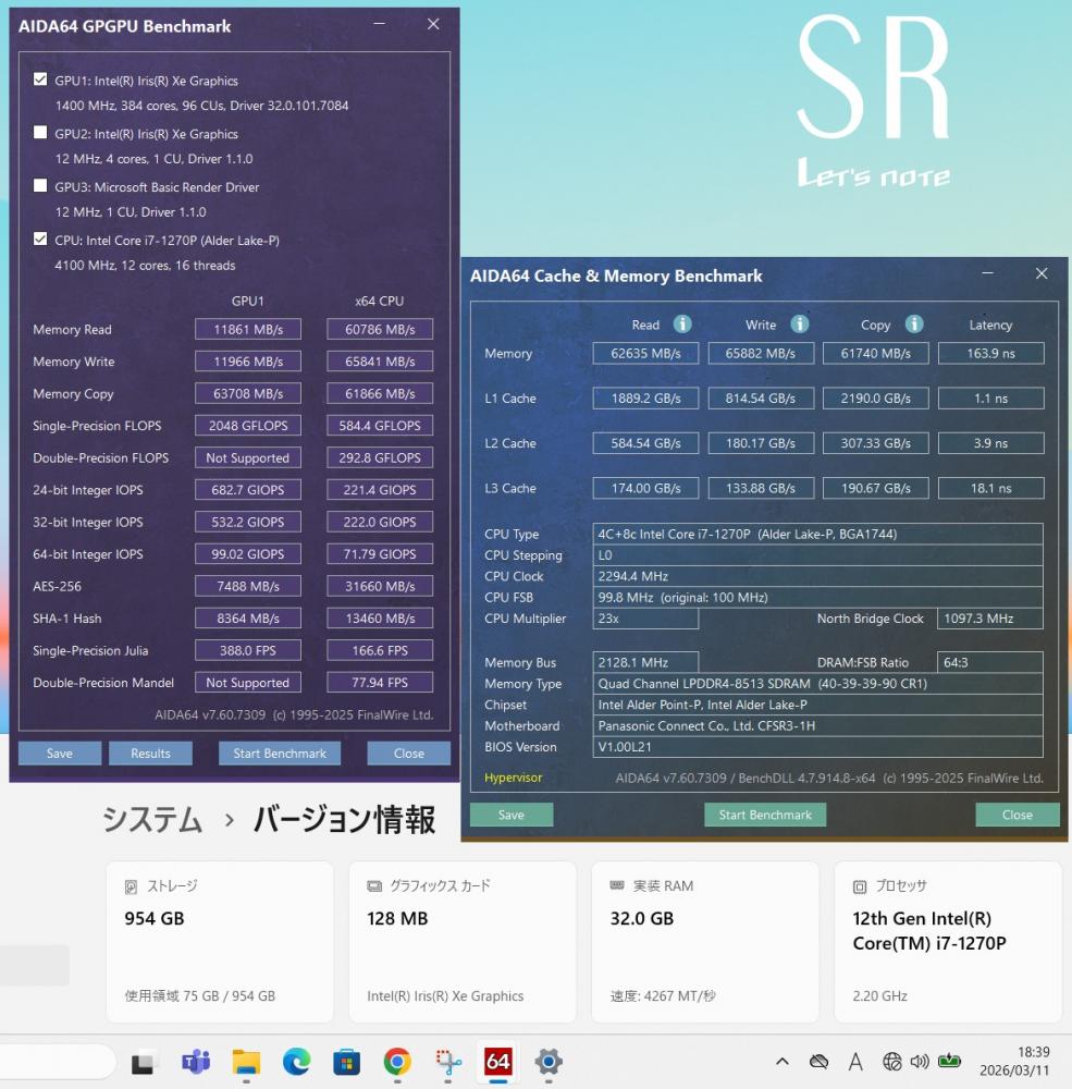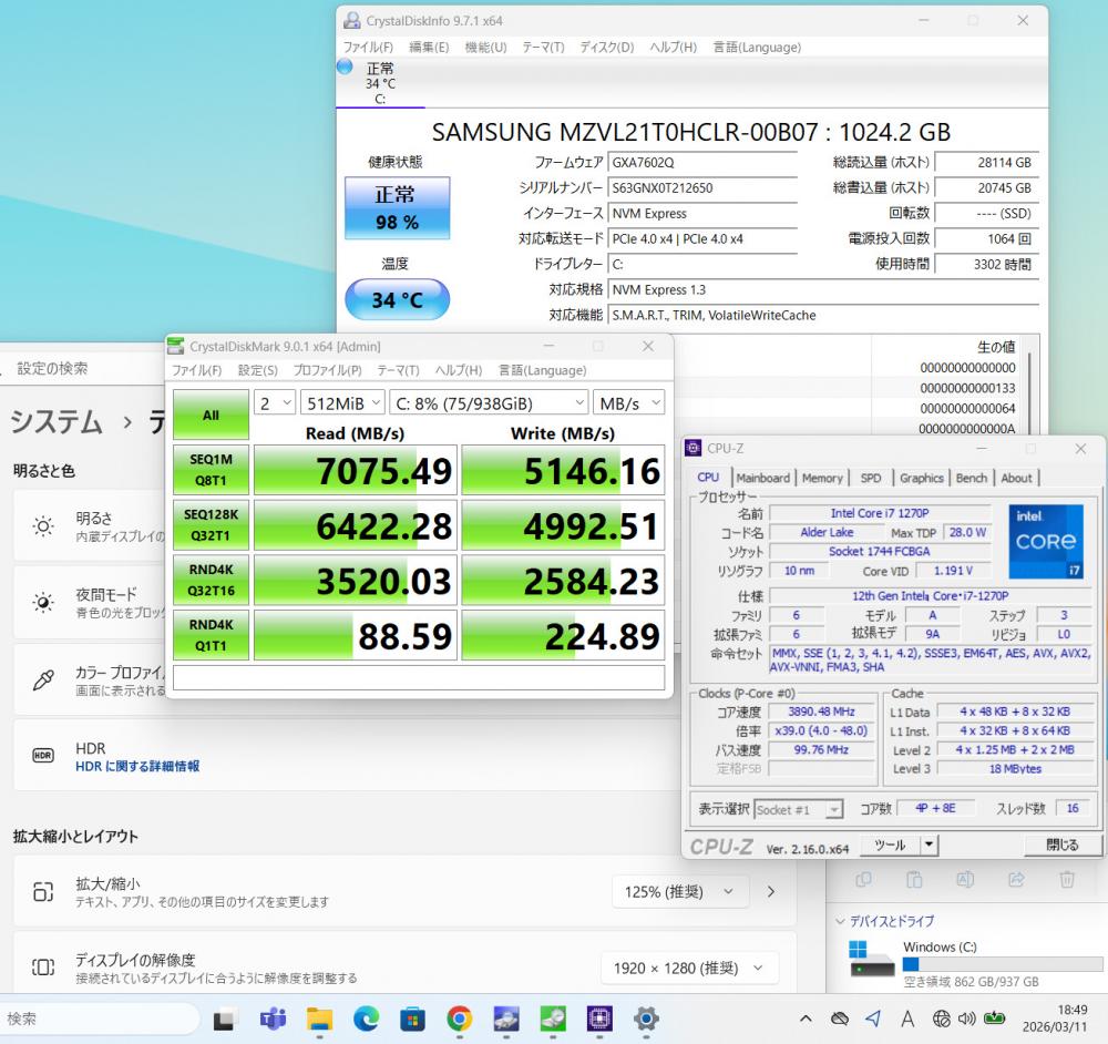 | CPU: 超高速 Intel 12コア 卓越性能 第12世代Core i7-1270P 2.2Ghz、 12コア16スレッド (ターボ・ブースト利用時の最大周波数 4.8GHz) |