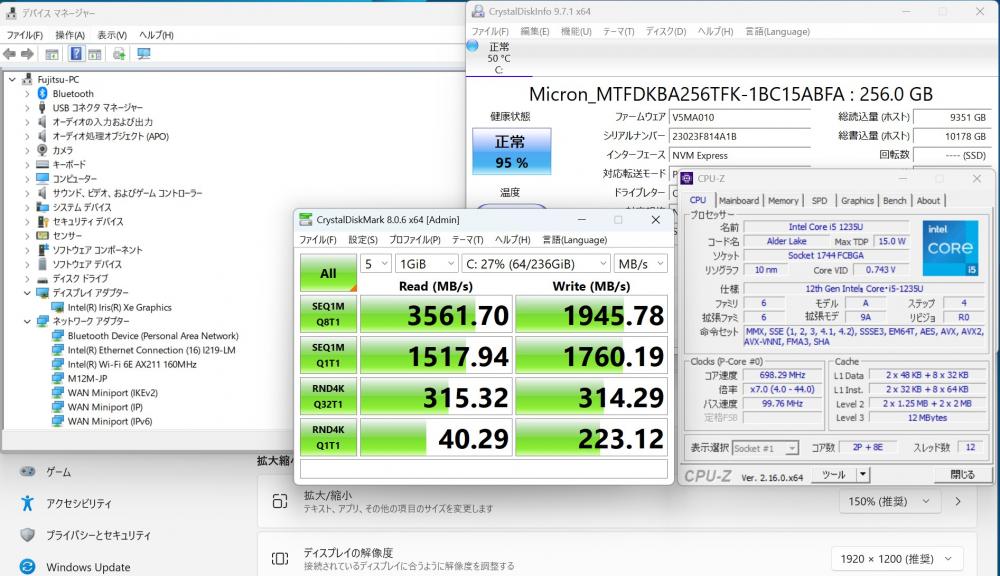 | CPU: 超高速 Intel 10コア 卓越性能 第12世代Core i5-1235U 1.3Ghz、 10コア12スレッド (ターボ・ブースト利用時の最大周波数 4.4GHz) |