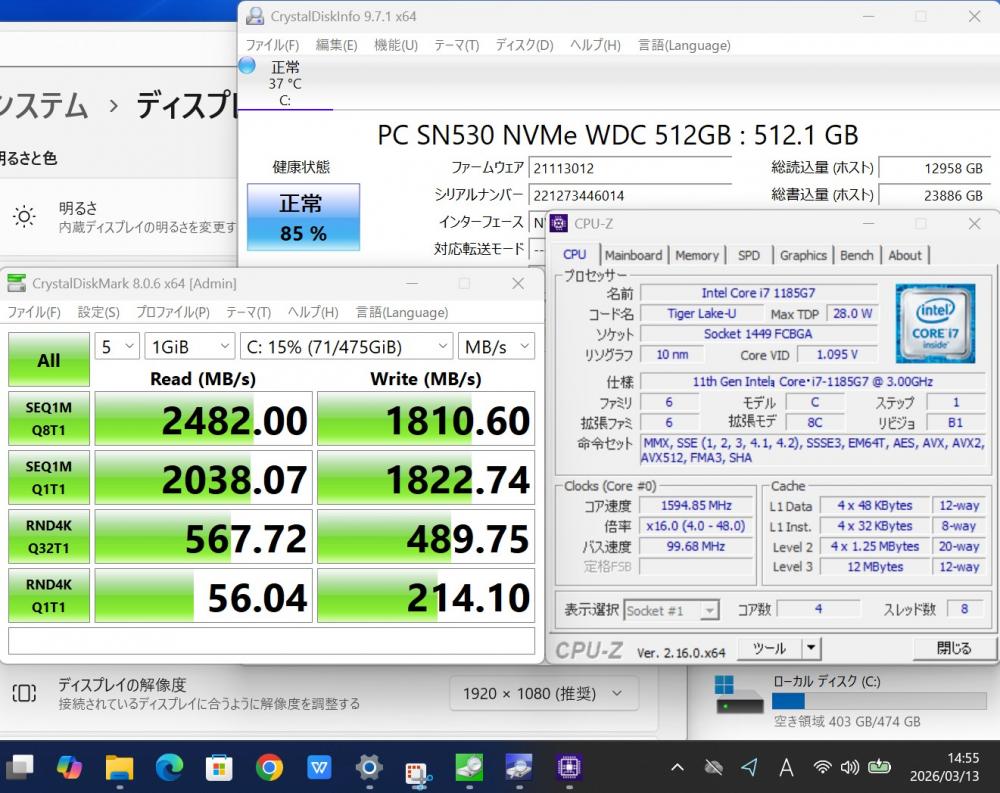 | CPU: 超高速 Intel 卓越性能 第11世代Core i7-1185G7 3.0Ghz、 4コア8スレッド (ターボ・ブースト利用時の最大周波数 4.8GHz) |