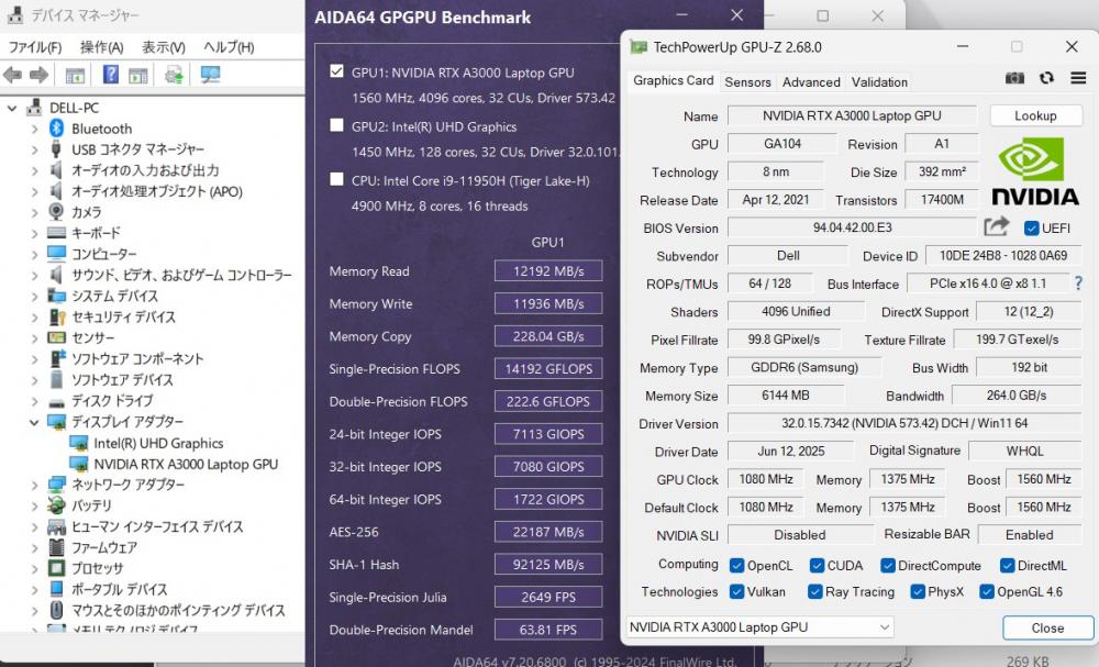 | ディスプレイ: フルHD 15.6インチ高輝度 広視野角 LEDバックライト 1920 x 1080解像度 グラフィックス NVIDIA RTX A3000 Laptop 搭載、大容量 6G専用ビデオメモリーvRAM 快適使用体験! 専門向けのグラフィックスですが、ゲーミング性能にも、RTX A3000 (Mobile) = RTX 2060 |