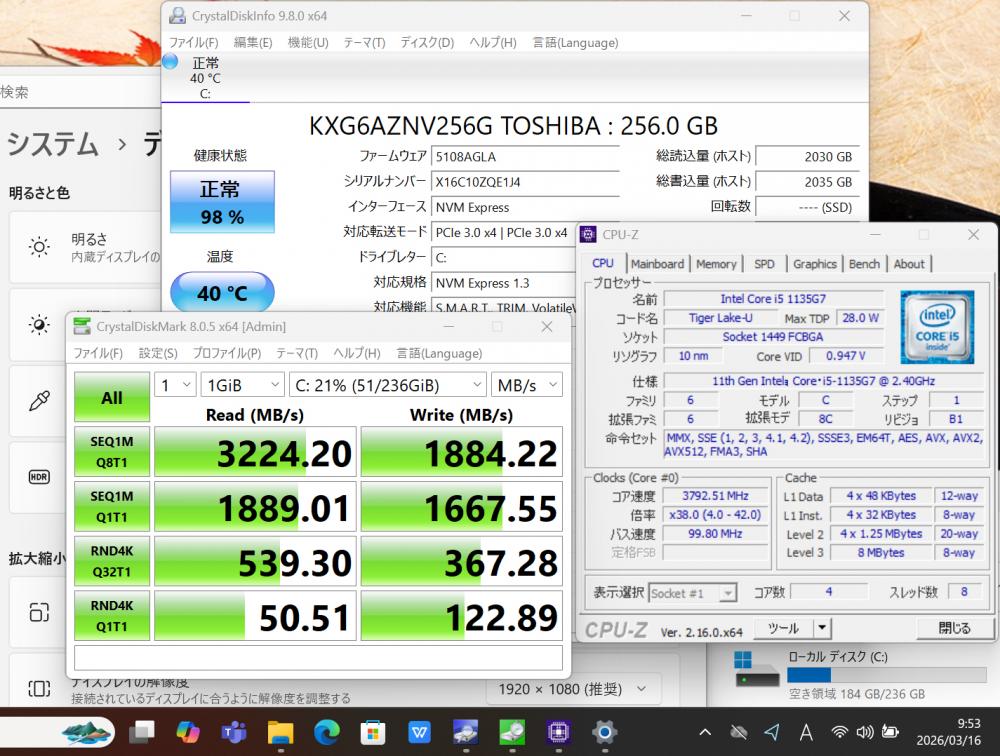 | CPU: 超高速 Intel 卓越性能 第11世代Core i5-1135G7 2.4Ghz、 4コア8スレッド (ターボ・ブースト利用時の最大周波数 4.2GHz) |