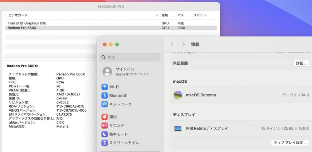| ディスプレイ: 2K対応 15.4インチ光沢液晶 高輝度 広視野角 LEDバックライト 2880 x 1800解像度 Retina ディスプレイ搭載により文字や写真を滑らかに表現することができます。 グラフィックス Radeon Pro 560X 搭載、大容量 4096M専用ビデオメモリーvRAM 快適使用体験! 専門向けのグラフィックスですが、ゲーミング性能にも、NVIDIA GTX 650Ti < Radeon Pro 560X < NVIDIA GTX 750Ti |