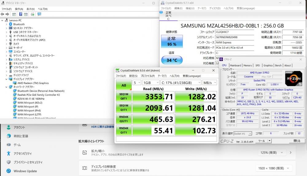 | CPU: 超高速 高性能 AMD Ryzen 5-5675U 2.3Ghz、 6コア12スレッド (ターボ・ブースト利用時の最大周波数 4.3GHz) |