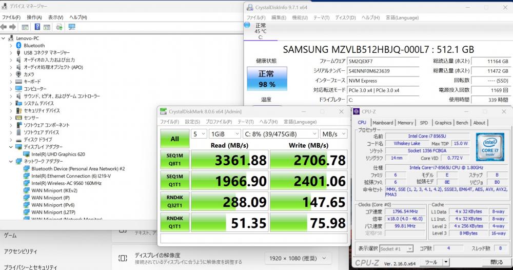 | CPU: 超高速 Intel 高性能 第8世代Core i7-8565U 1.8Ghz、 4コア8スレッド (ターボ・ブースト利用時の最大周波数 4.6GHz) |