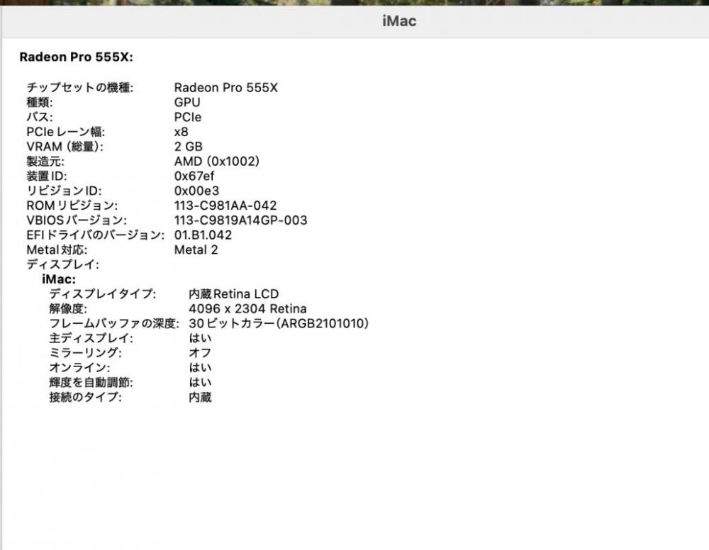 | ディスプレイ: 4K液晶 21.5インチ光沢液晶 高輝度 広視野角 LEDバックライト 4096 x 2304解像度 Retina ディスプレイ搭載により文字や写真を滑らかに表現することができます。 グラフィックス Radeon Pro 555X 搭載、大容量 2048M専用ビデオメモリーvRAM 快適使用体験! 専門向けのグラフィックスですが、ゲーミング性能にも、NVIDIA GT 1030 < Radeon Pro 555X < NVIDIA GTX 650Ti |