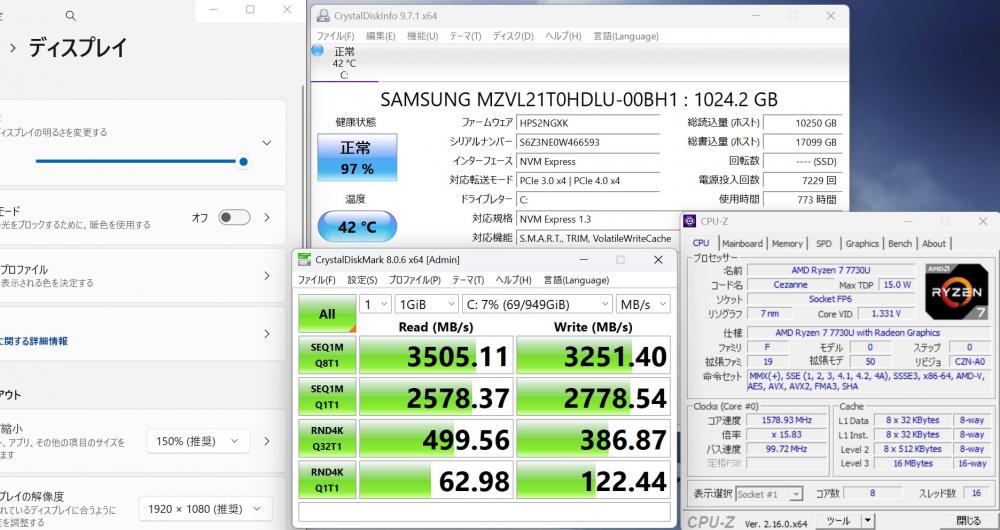 | CPU: 8コア 超高性能 AMD Ryzen 7-7730U 2.0Ghz、 8コア16スレッド (ターボ・ブースト利用時の最大周波数 4.5GHz) |