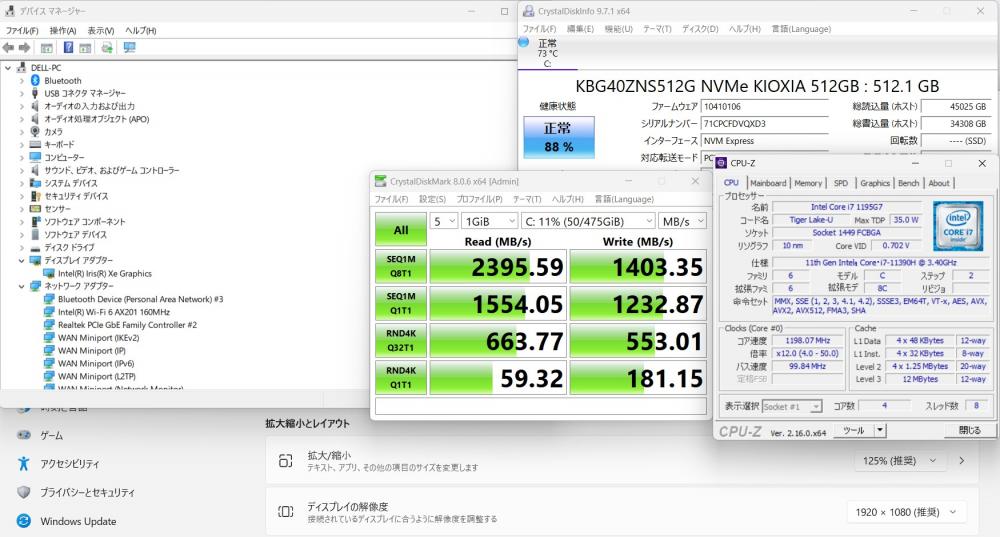 | CPU: 超高速 Intel 卓越性能 第11世代Core i7-11390H 3.4Ghz、 4コア8スレッド (ターボ・ブースト利用時の最大周波数 5.0GHz) |