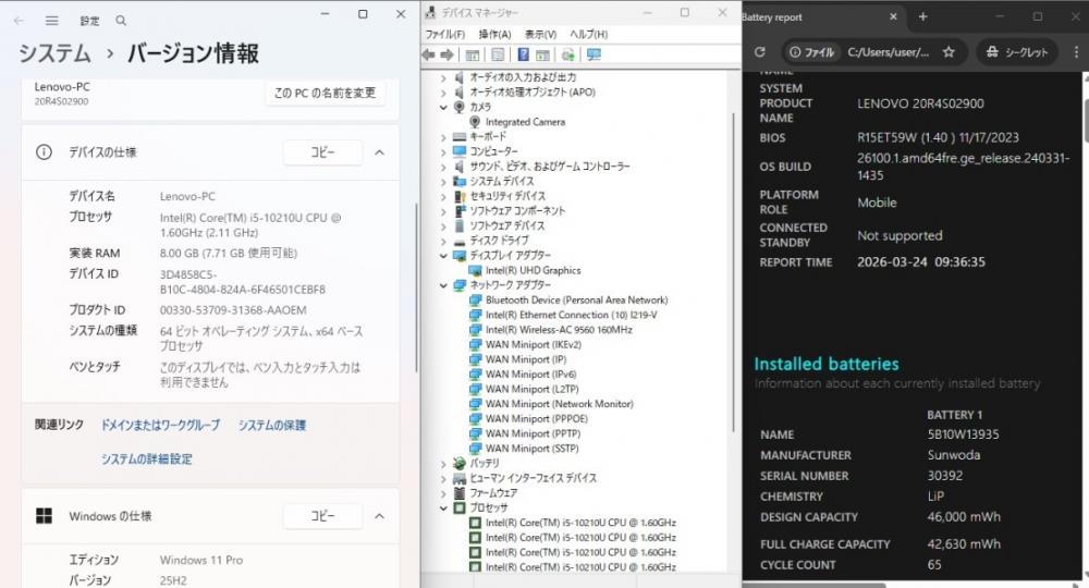 バッテリー電池の健康度は 92% です。3時間位も使用可能と表示されている。 バッテリーは消耗品の為、動作補償外となります。