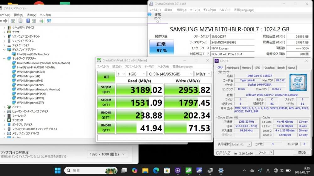 | CPU: 超高速 Intel 卓越性能 第11世代Core i7-1165G7 2.8Ghz、 4コア8スレッド (ターボ・ブースト利用時の最大周波数 4.7GHz) |
