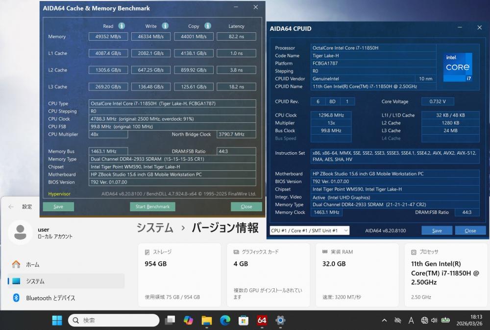 | CPU: 超高速 Intel 8コア 卓越性能 第11世代Core i7-11850H 2.5Ghz、 8コア16スレッド (ターボ・ブースト利用時の最大周波数 4.8GHz) |