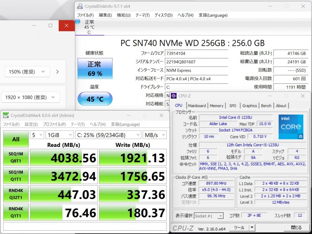 | CPU: 超高速 Intel 10コア 卓越性能 第12世代Core i5-1235U 1.3Ghz、 10コア12スレッド (ターボ・ブースト利用時の最大周波数 4.4GHz) |