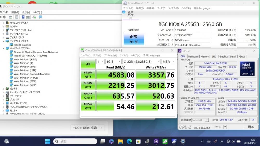 | CPU: 超高速 Intel 12コア 超高性能 第14世代Core Ultra 5-135u 1.6Ghz、 12コア14スレッド (ターボ・ブースト利用時の最大周波数 4.4GHz) |