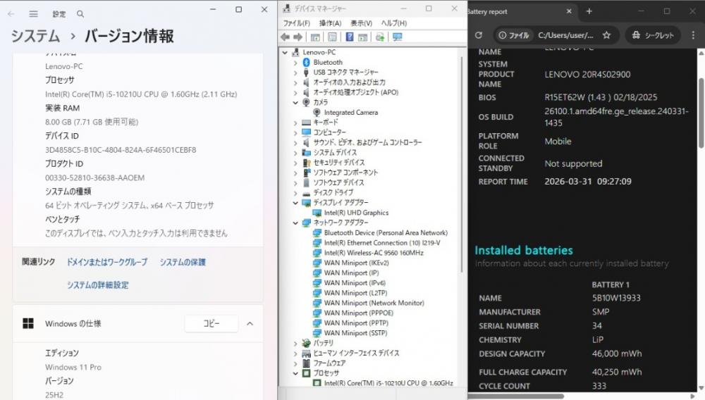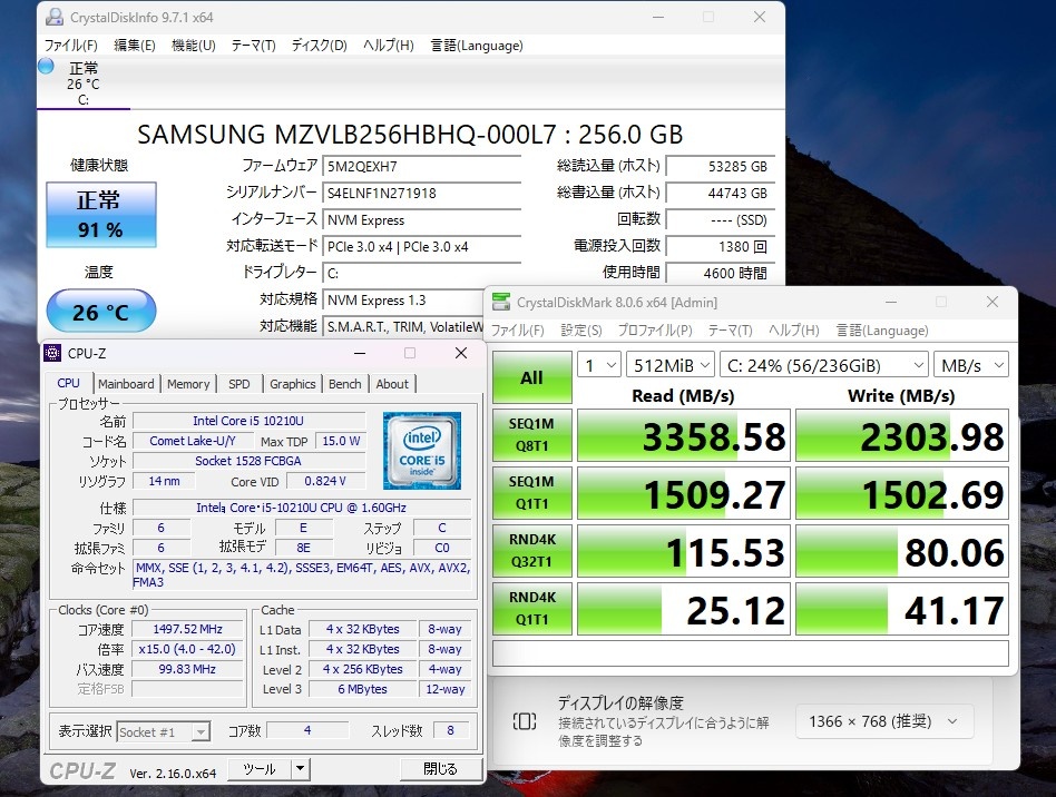 | CPU: 超高速 Intel 超高性能 第10世代Core i5-10210U 1.6Ghz、 4コア8スレッド (ターボ・ブースト利用時の最大周波数 4.2GHz) |