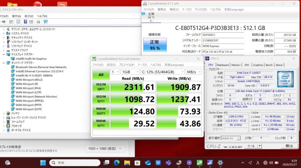 | CPU: 超高速 Intel 卓越性能 第11世代Core i7-1165G7 2.8Ghz、 4コア8スレッド (ターボ・ブースト利用時の最大周波数 4.7GHz) |