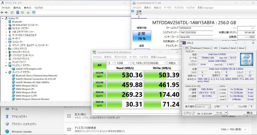 | CPU: 超高速 Intel 高性能 第8世代Core i5-8365U 1.6Ghz、 4コア8スレッド (ターボ・ブースト利用時の最大周波数 4.1GHz) |