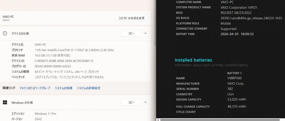 バッテリー電池の健康度は 91% です。4時間半位も使用可能と表示されている。 バッテリーは消耗品の為、動作補償外となります。