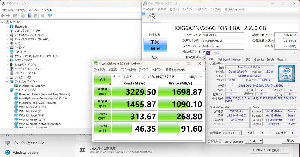| CPU: 超高速 Intel 超高性能 第10世代Core i5-10210U 1.6Ghz、 4コア8スレッド (ターボ・ブースト利用時の最大周波数 4.2GHz) |