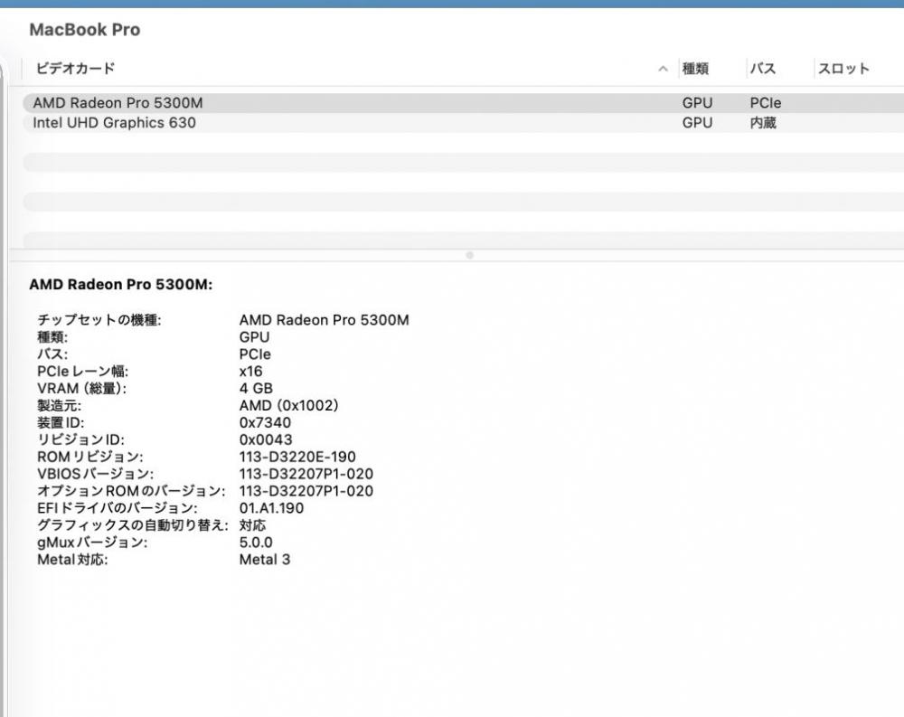 | ディスプレイ: 3K液晶 16インチ光沢液晶 高輝度 広視野角 LEDバックライト 3072 x 1920解像度 Retina ディスプレイ搭載により文字や写真を滑らかに表現することができます。 グラフィックス Radeon Pro 5300M 搭載、大容量 4096M専用ビデオメモリーvRAM 快適使用体験! 専門向けのグラフィックスですが、ゲーミング性能にも、Radeon Pro 5300M = NVIDIA GTX 1050Ti |