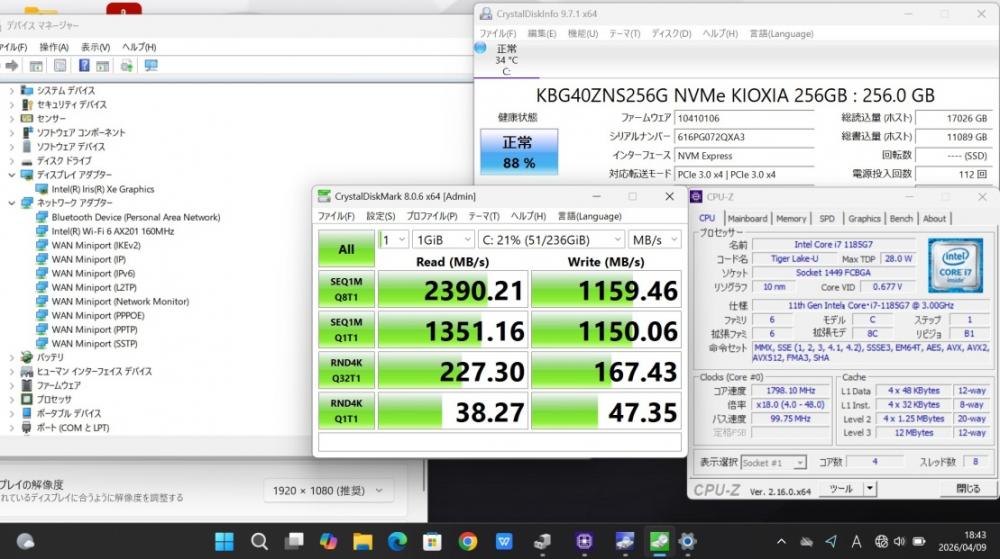 | CPU: 超高速 Intel 卓越性能 第11世代Core i7-1185G7 3.0Ghz、 4コア8スレッド (ターボ・ブースト利用時の最大周波数 4.8GHz) |